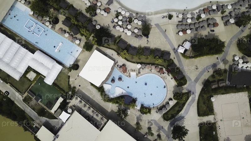 Люди, лежащие на шезлонгах возле бассейна, вид сверху.Люди, плавающие в бассейне с верхним углом обзора, который имеет синий цвет воды и солнечный свет, отражаются на поверхности.Вид людей, купающихся в бассейне в солнечный день