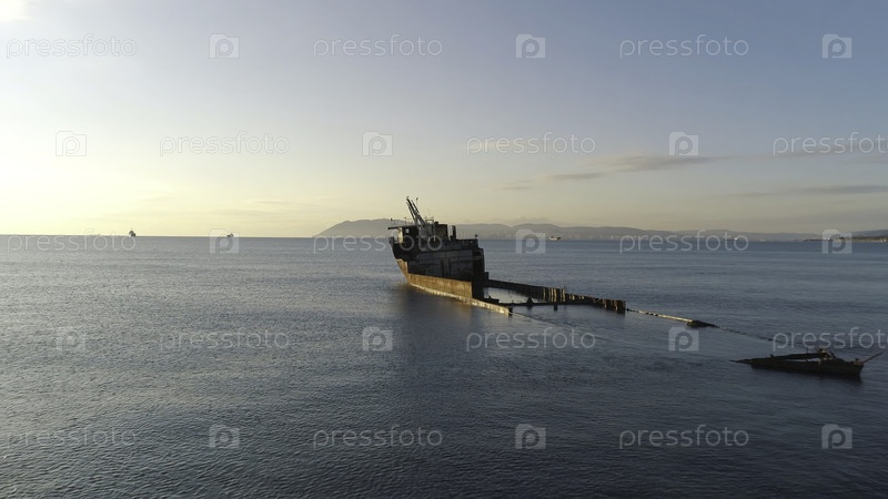 Вид старого затонувшего корабля на мелководье в море против заката солнца и гор. стрельба. старый корабль