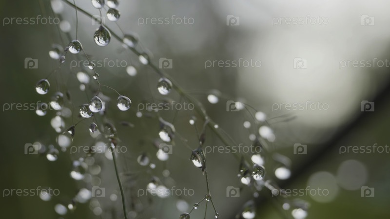 Большие капли росы на траве, большая вода падает на траву