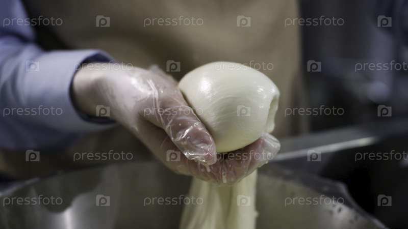 Закройте руки, делая перчатки, делая сыр моцарелла, концепцию еды. Рамка. Работник фабрики сыра
