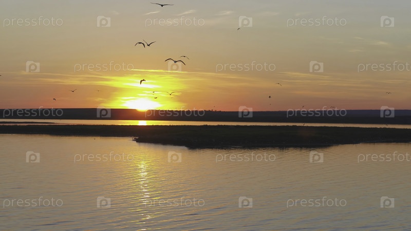 Стадо птиц против красочного неба.Закат на реке.Остров чайки.Птицы летают при закате, из воздуха