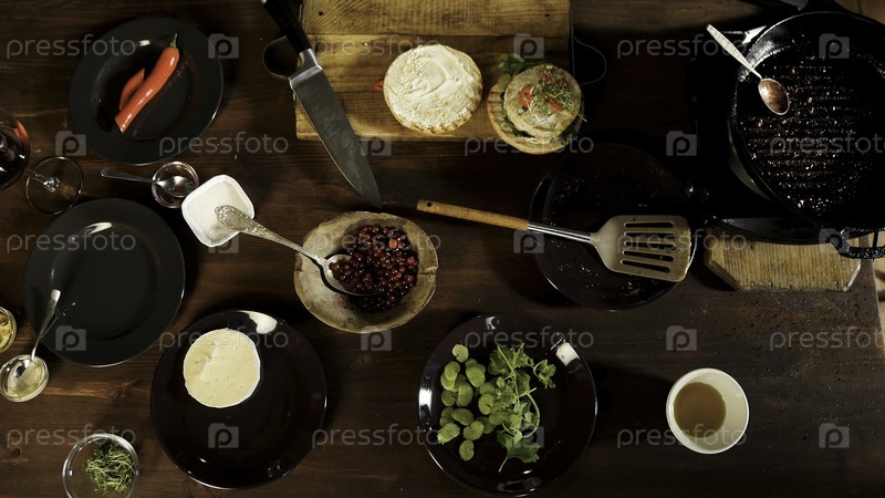 Вид ингредиентов гамбургера на деревянном столе. Резервные кадры. Сыр кемберт, красный перец чили, петрушка, сельдерей и соусы