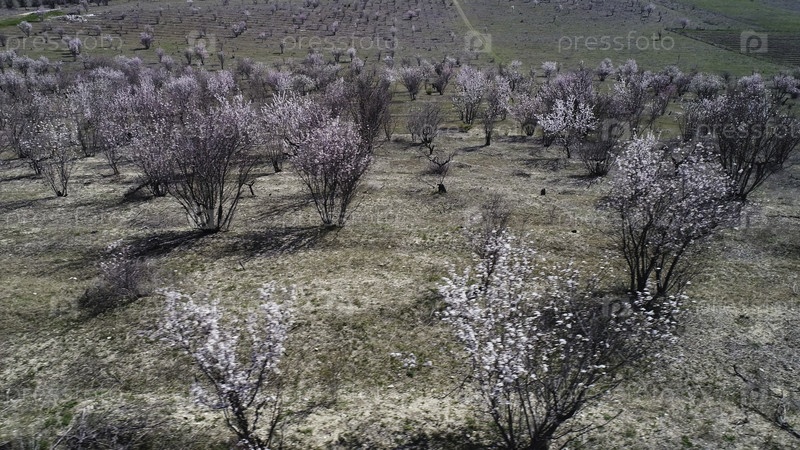 Вид с воздуха небольших деревьев, растущих рядами на сельскохозяйственных полях перед красивым озером, концепция сельского хозяйства.Стрельба.Небольшой буксир расположен в долине в солнечный летний день