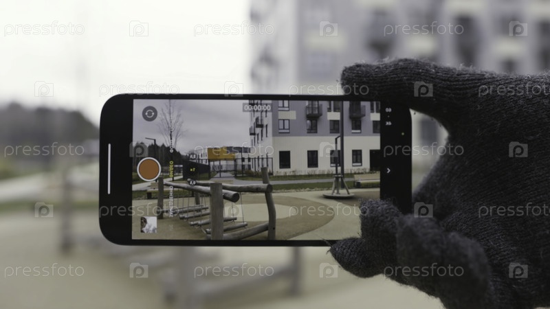 Завершение технологической демонстрации камеры смартфона во время видеосъемки детской площадки. нажатие пальца на экран и выбор режима увеличения, нормального режима и широкоугольного режима