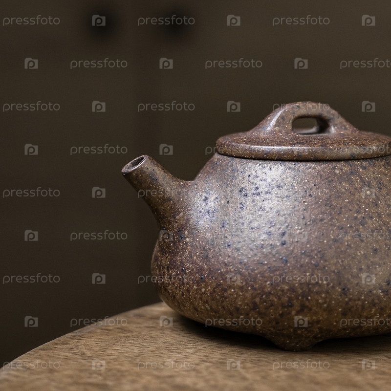 Красивый и элегантный коричневый керамический чайник красиво отображается на деревянном столе