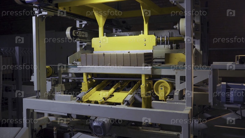 Завод по производству строительного материала с готовым кирпичом, промышленное строительство. Производство кирпичей на фабрике. Рабочий процесс, крупный план. Многие кирпичи