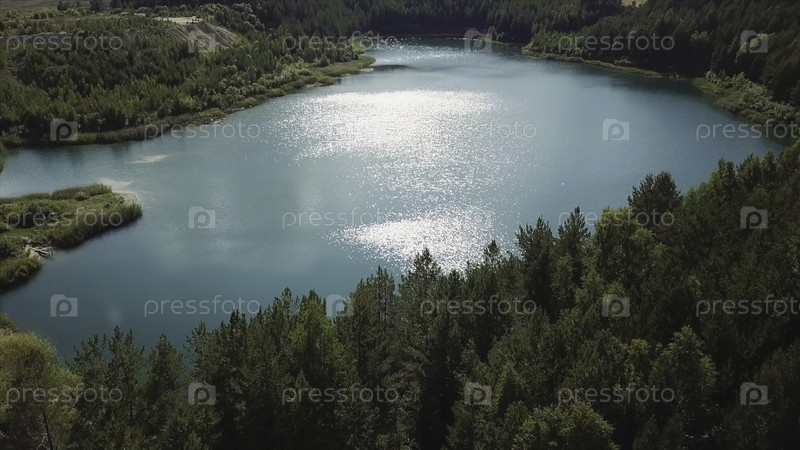 Полет над лазурьевой водой озера и зеленым лесом.Авиационный вид на захватывающий летний пейзаж с красивым бирюзовым озером, окруженным зелёными деревьями