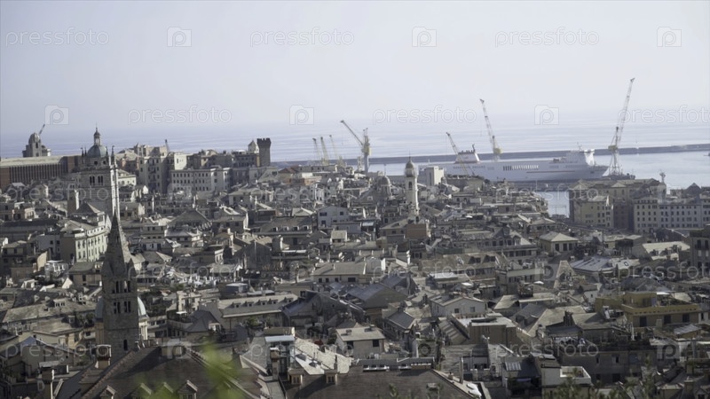 Панорама старого города с морским портом. Идите дальше. Старый европейский город с каменными домами расположен недалеко от порта. Корабли в порту старого города