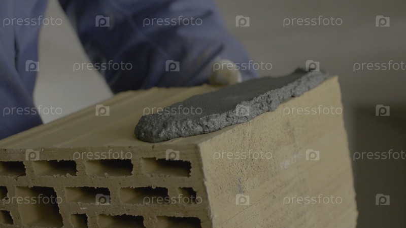 Строительство кирпичной стены.Тролл бросает цемент на кирпичи.Работник рассыпает цемент по кирпичам