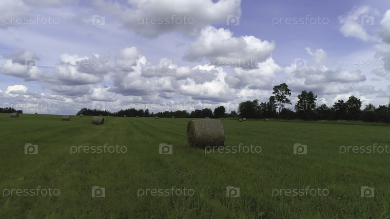 Летний пейзаж лугов, вырубленных во время сбора урожая.Сеноводы сушат под солнцем, готовят корм для животных, сельский экологический регион