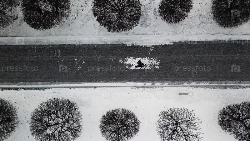 Вид с воздуха зимнего бегуна в туманный день через парк.Молодой человек, бегающий и бегущий в природном парке, потрясающие виды.Взгляд с воздуха Молодой человек пробегает по зимнему лесу утром