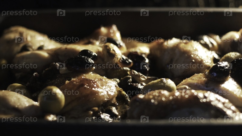 Трей заполнен куриными грудями внутри печи. продолжайте. закройте курицу, выпеченную в духовке с оливками, специями, чесноком и растительным маслом, едой и кулинарной концепцией