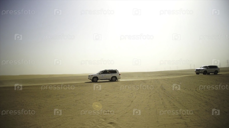 Сафари пустынных внедорожников прокладывают свой путь через арабские песчаные дюны