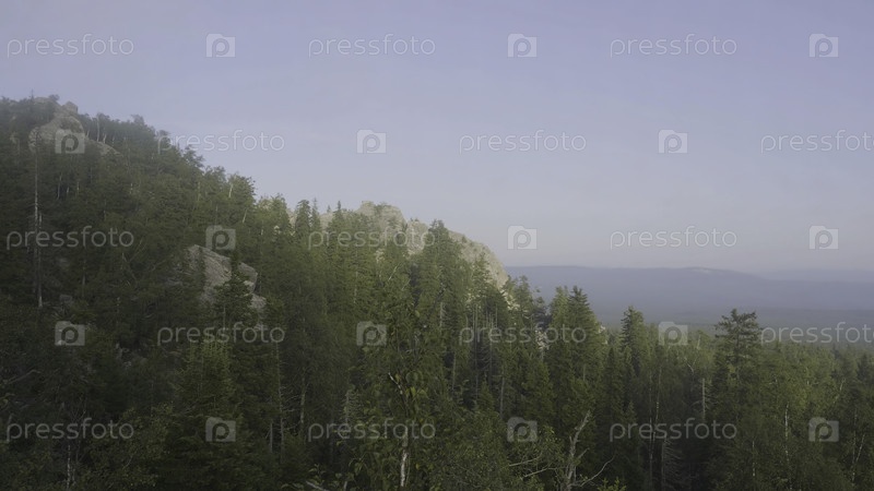 Горные вершины с видом на деревья горного леса.Горная местность и лес в тумане.Прекрасный лес и горы
