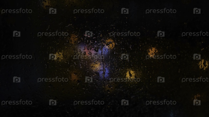 Закрытие капель дождя на стекле на фоне размытых огней в темноте. Концепция. Размытые огни за окном, когда ночью идет дождь