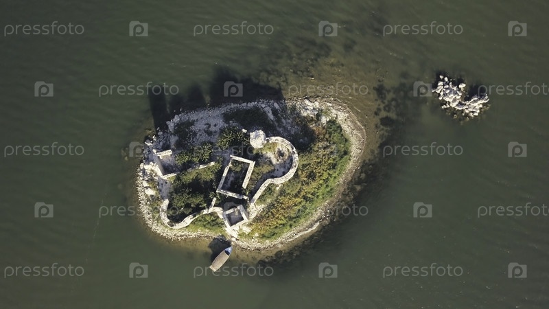 Вид на маленький остров с руинами. Сток. Руины старого дома на небольшом участке земли, окруженном морем. Забытое место со скованной лодкой, окружённая водой со всех сторон