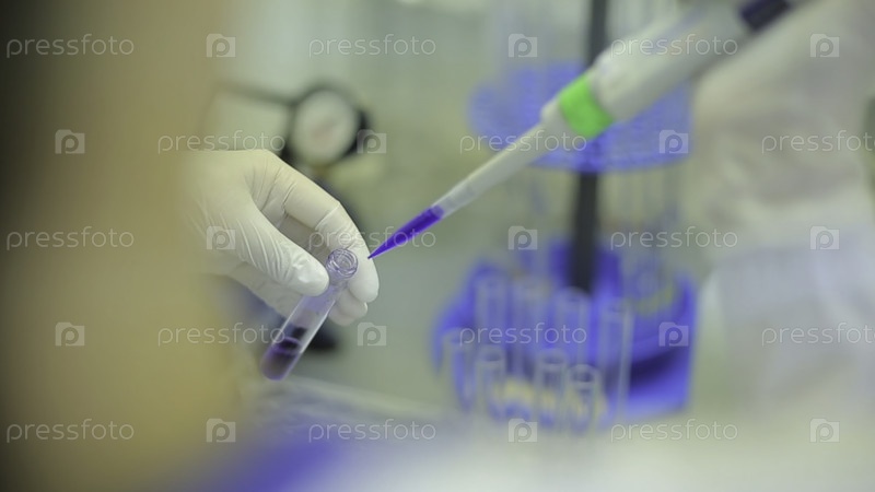 Близкие пробирки. Медицинское оборудование. Закрытое изображение ученого, использующего микропипету в лаборатории. Техник вводит жидкость в пластинку с микротитром. Испытательные трубки. Немного глубины поля