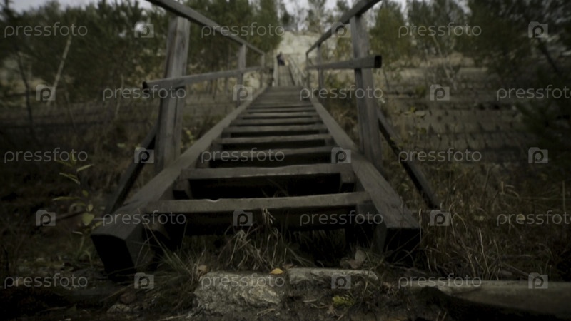 Мужчина поднимается по лестнице. Видеозапись. Старые деревянные ступени на холме, возвышающиеся с обеих сторон травы. Деревянная лестница вверх по травянистому холма