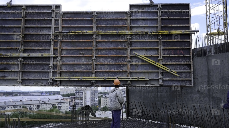Строительство современного здания и небоскреба. строительный работник на стройке