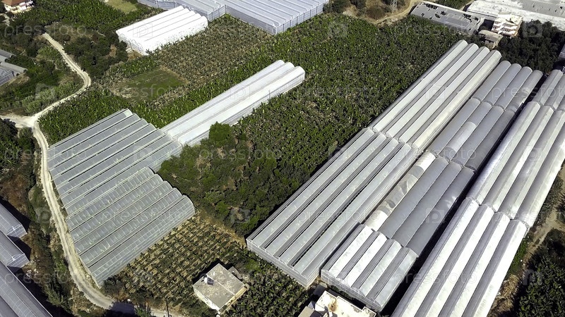 Вид на оранжереи плантаций сверху. Клип. Область города с сельским хозяйством для выращивания пищевой растительности вблизи жилых районов. Городское земледелие на побережье летом
