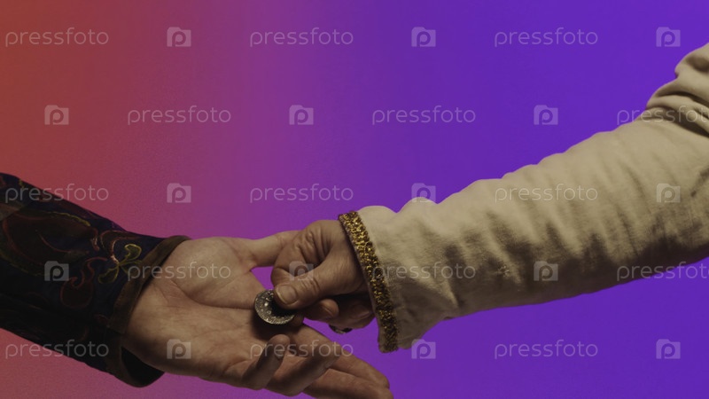 Человек в средневековой одежде передает монету.Сток.Концепция торговли в Средние века