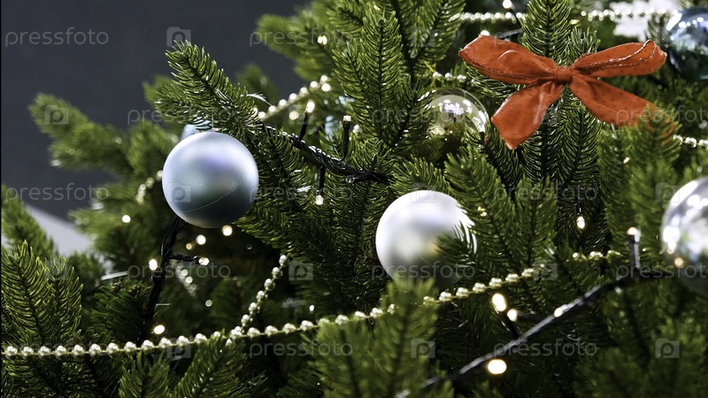 Декорированная рождественская елка на размытом, сверкающем и сказочном фоне. На дереве висят новогодние игрушки. Классические Рождество и Новый год украшают интерьер комнаты подарками и ёлкой