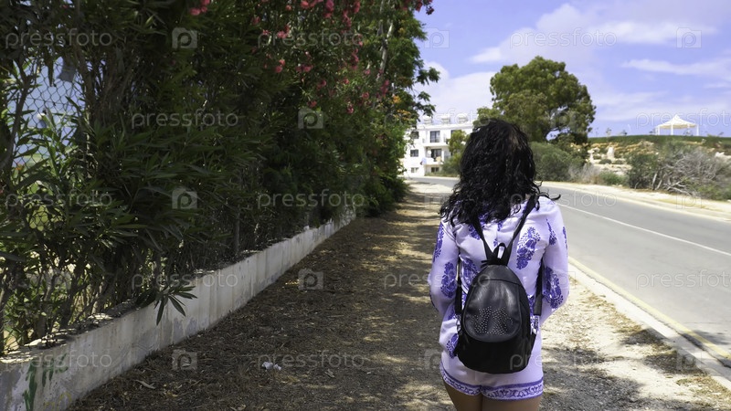 Красивая женщина-путешественница идет по дороге, вид сзади