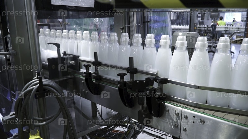 Концепция завода и исследования. Бутылки с белым веществом, стоящие на производственном объекте, будут искривлены. Бутылки в очереди на конвейере. Процесс производства