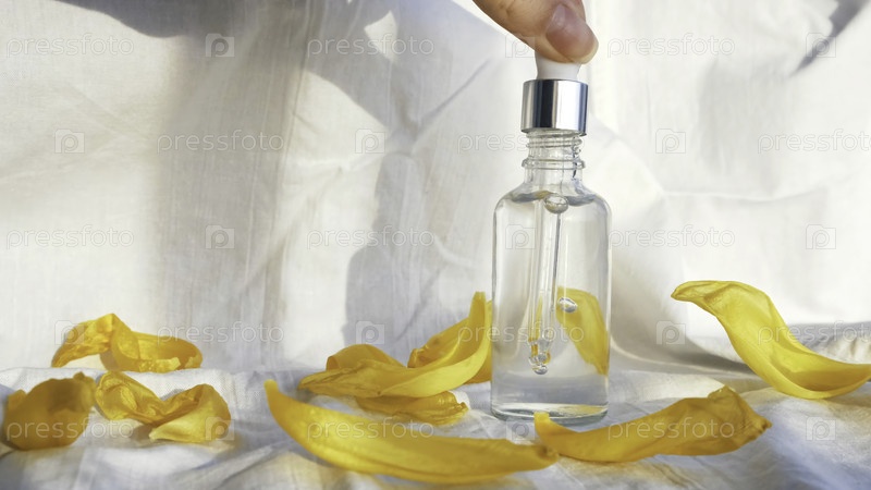 Сыворотка и капельница на белом текстильном фоне, натуральная косметика.Закрывайте желтые лепестки цветов и деликатные женские руки, при этом прикасаясь к маленькой стеклянной бутылке с маслом внутри