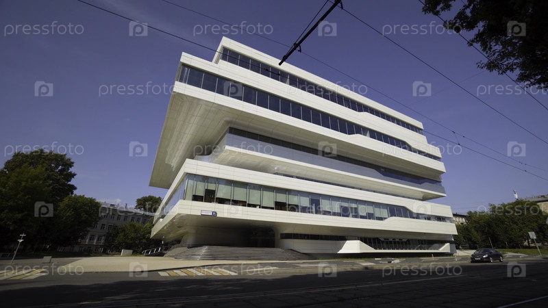 Красивый белый фасад футуристического офисного здания.Продолжайте.Фасад бизнес-центра в авангардном стиле на фоне голубого неба