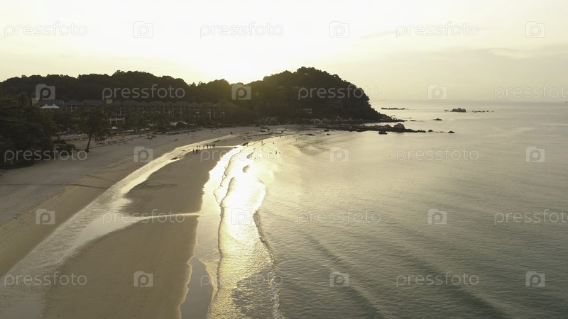 Деревья растут на скале, окруженной морем на фоне заката солнца. стрельба. Скала покрыта зелеными деревьями на удивительном фоне морского пейзажа
