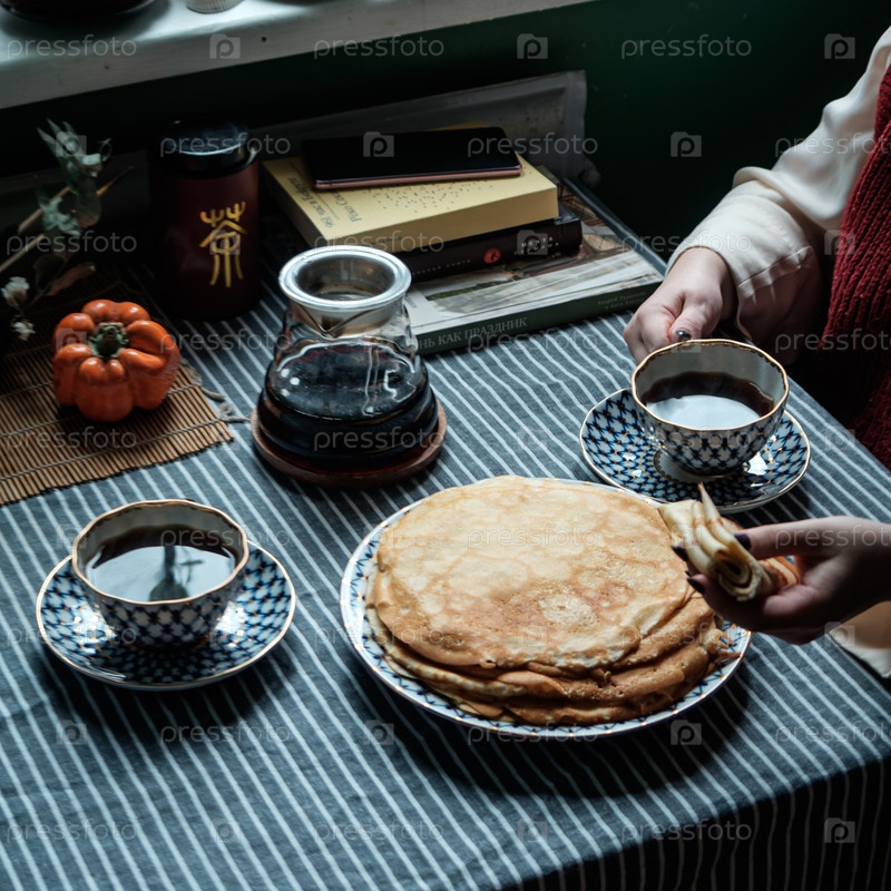 Уютный обеденный стол, красиво устроенный с блинами, маслом, кофе и многим другим