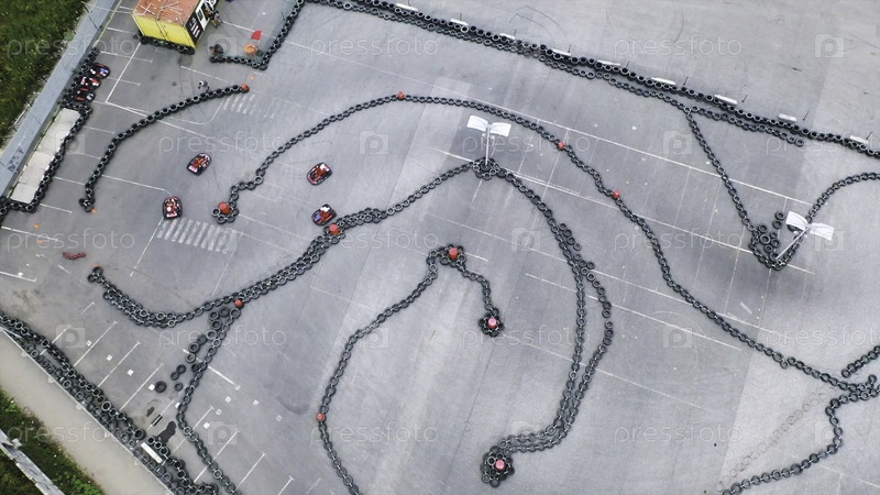 Вид с воздуха карт пилотов, тренирующихся или соревнующихся на картинговых трассах в защитных униформах и шлемах