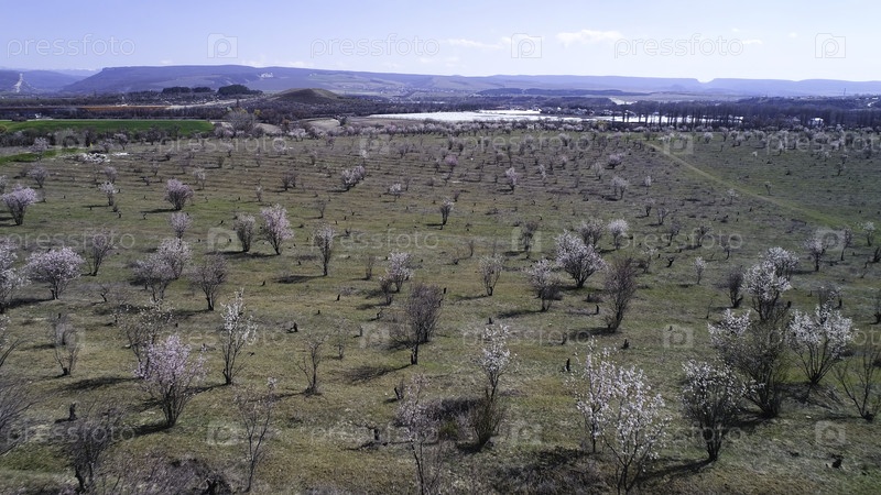 Вид с воздуха небольших деревьев, растущих рядами на сельскохозяйственных полях перед красивым озером, концепция сельского хозяйства.Стрельба.Небольшой буксир расположен в долине в солнечный летний день