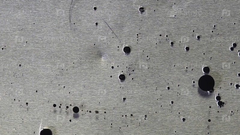 Вид сверху черных капель чернил, текущих в жидком масле на металлическом сером фоне. Черные шарики краски, плавающие на поверхности масляного вещества