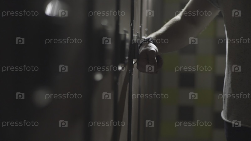 Рука мужчины открывает шкафчик с электрическим ключом на запястье в тренажерном зале в раздевалке. Рама. Закройте руку, открывая раздевалку в раздевалке спортзала