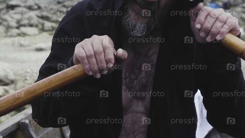 Старик гребёт в деревянной лодке. 'Сток'. Старый мужчина с бородой и татуировкой на груди быстро уплывает от берега в одиночестве в деревянной лодке. Близнецы старика крепко гребают веслами