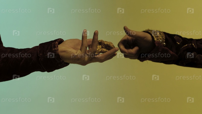 Восточный мужчина берет кусок золотой крупицы у другого человека, его руки изолированы на красочном фоне