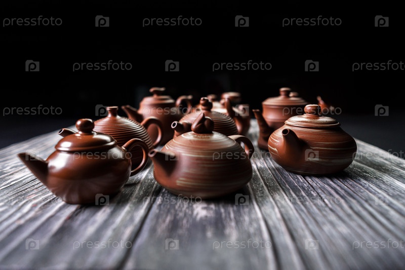 Элегантная коллекция изысканных традиционных чайников красиво выставлена на деревянном столе