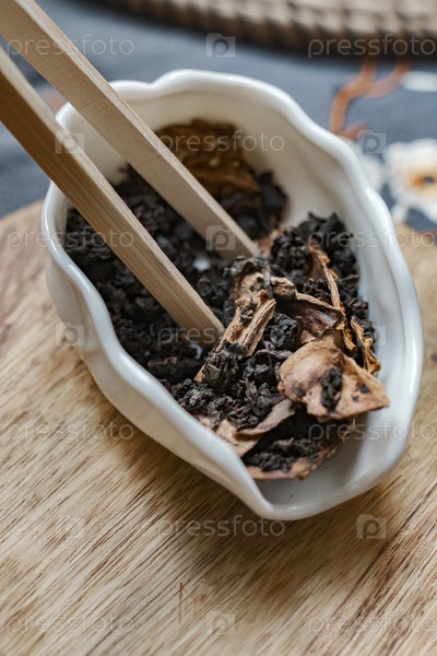 Художественная коллекция растительных ингредиентов красиво представлена в уникальной миске со палочками
