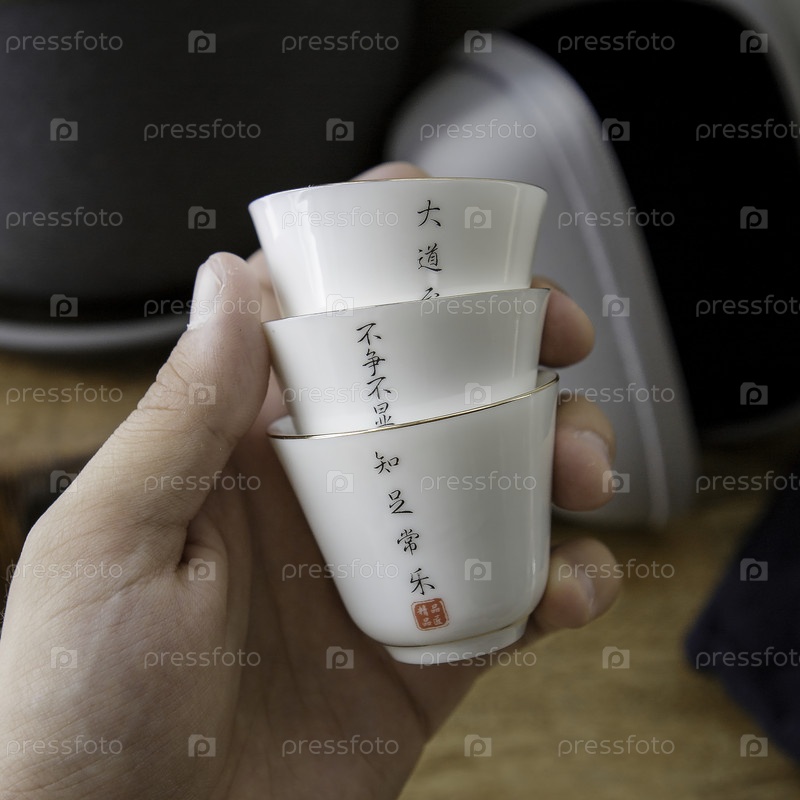 Элегантная рука держит три чашки с чаем, каждая из которых украшена потрясающей калиграфией, идеально подходит для любителей чая