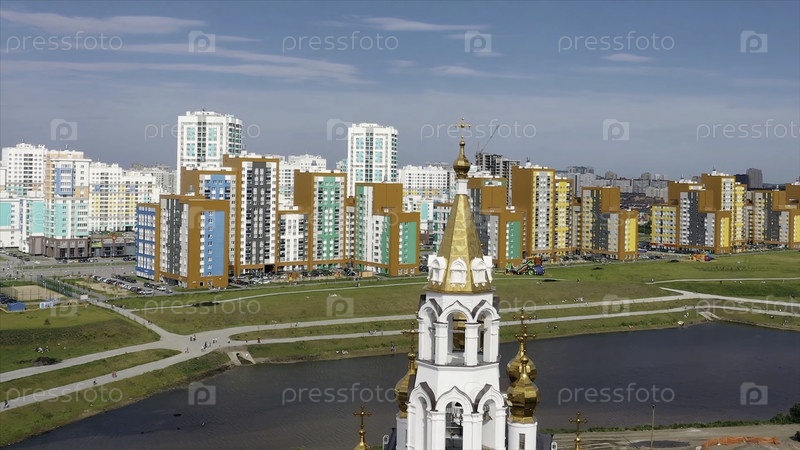Вид с воздуха белой церкви с небольшим золотым куполом и крестом возле пруда. видео. солнечный летний день среди красочных зданий
