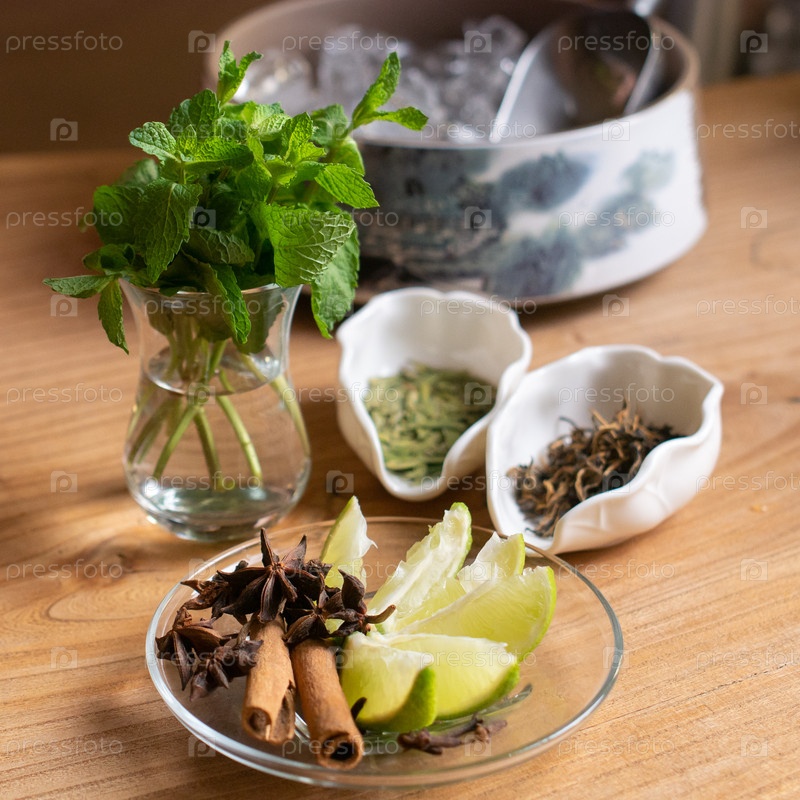 Красочный ассортимент ярких трав и специй красиво устроен, идеально подходит для приготовления пищи и освежающих напитков