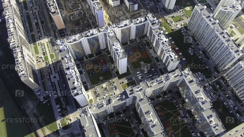 Панорамный вид на большие жилые комплексы и дворы с развитой инфраструктурой, дороги, стадионы, школы, парковки и детские площадки