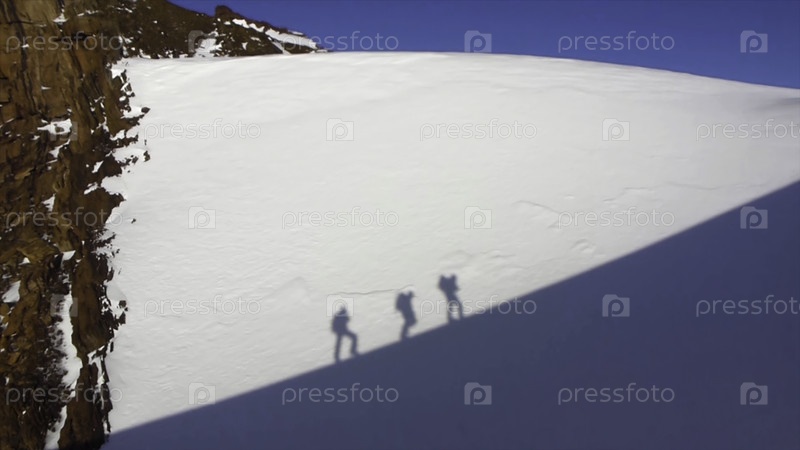 Силуэт людей, поднимающихся по выступающей скале высоко над облаками и горами, солнцем, красивым красочным небом и облаками позади