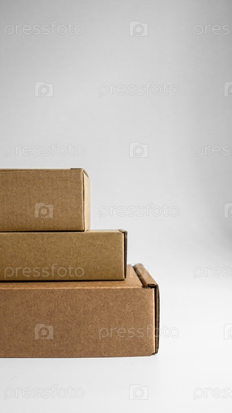 Три аккуратно сложенных коричневых коробки на гладком фоне идеально подходят для идеи доставки и упаковки