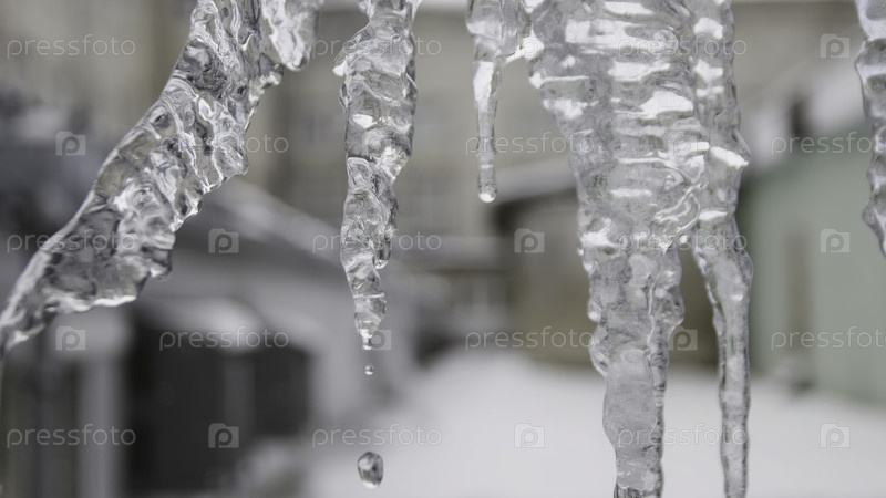 Закройте ледники с кристаллической текстурой на зимнем фоне.Капли воды выпадают из прозрачных сталактитов во время процесса таяния