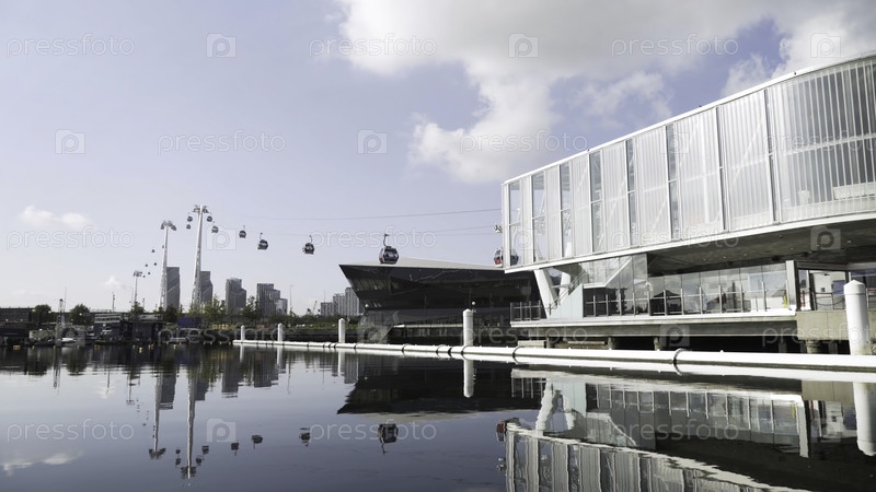 Летний пейзаж канатной дороги через реку на фоне голубых облаков неба.Красивое стеклянное фасадное здание и небоскребы в городе