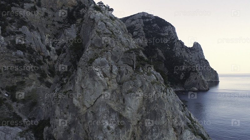 Вид с воздуха на огромные скальные образования с деревьями на вершине горы и синим морем и небом в фоне.Впечатляющий природный морской пейзаж со крутыми скалами