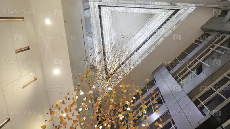 Люстры конфети в современном здании, вид снизу Золотой кристалл, абстрактный фон Блестящий фон из свечей